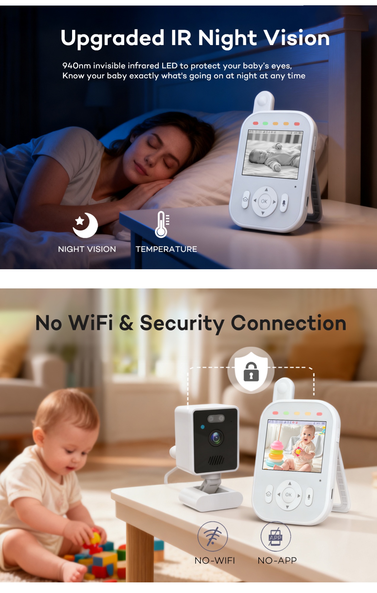 • Non-wifi & non-app design: No complicated setup, no privacy risks, and no reliance on smartphones or internet. Just pair the camera and monitor, and you’re ready to go—simple, secure, and always accessible. This video baby monitor prioritizes ease of use and reliability, so you can focus on what matters most: your baby’s safety and comfort. Whether you’re in the next room or across the house, stay connected without the hassle. Bring home reassurance today. Shop our Video Baby Monitor and enjoy peace of mind with every peek.