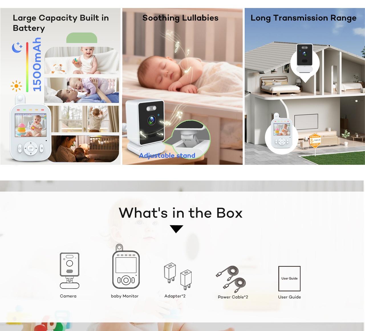 • Built-in lullabies: Soothe your baby to sleep with gentle, preloaded lullabies—no need for extra devices; simply trigger the calming tunes directly from the monitor.