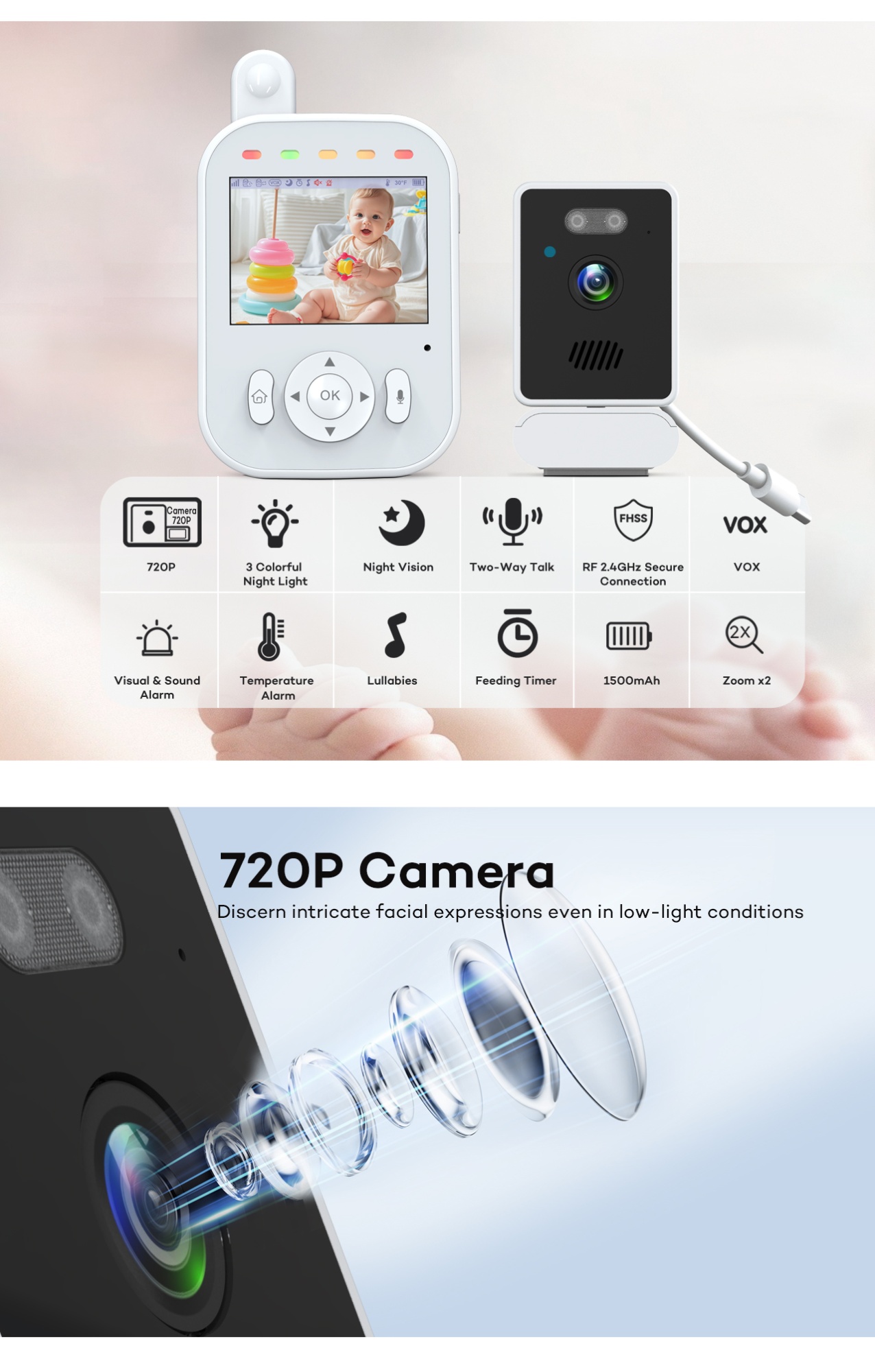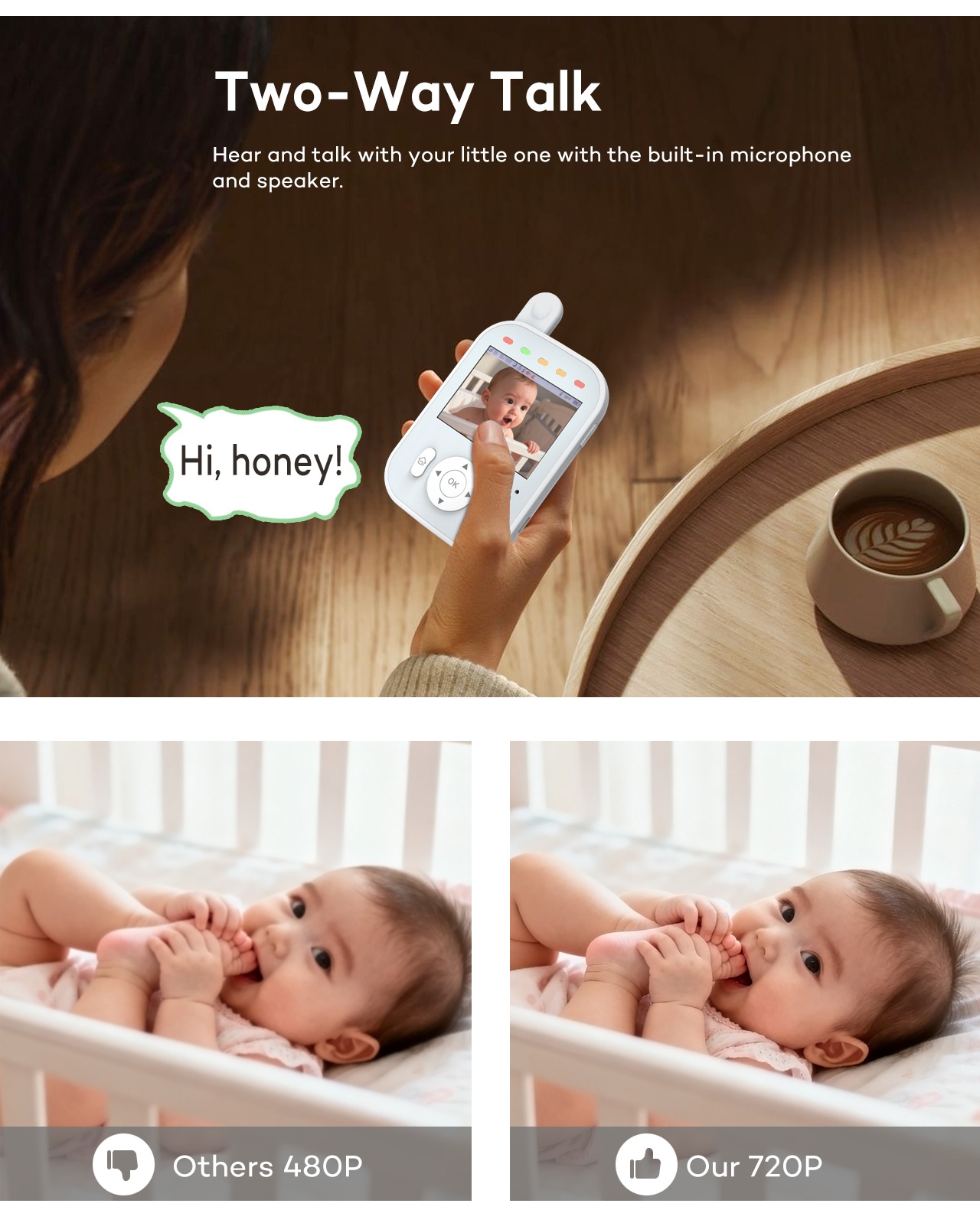 • 720P HD camera: Captures sharp, detailed footage so you can see every smile, yawn, or cozy snuggle with crystal-clear clarity, day or night.